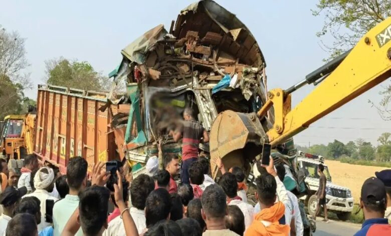 जेसीबी मशीन से क्षतिग्रस्त ट्रक के केबिन को काटकर ड्राइवर का शव बाहर निकाला गया।
