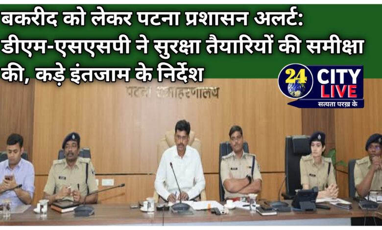 24CITYLIVE/आदर्श सिंह/पटना, 04 जून, 2025: ईद-उल-जोहा (बकरीद) के आगामी त्योहार को शांतिपूर्ण और सौहार्दपूर्ण तरीके से संपन्न कराने के लिए पटना जिला प्रशासन पूरी तरह से मुस्तैद हो गया है। जिलाधिकारी डॉ. त्यागराजन एस.एम. और वरीय पुलिस अधीक्षक अवकाश कुमार ने बुधवार को एक उच्चस्तरीय बैठक कर विधि-व्यवस्था बनाए रखने की तैयारियों की गहन समीक्षा की और सभी संबंधित अधिकारियों को सुरक्षा के कड़े इंतजाम सुनिश्चित करने के निर्देश दिए।