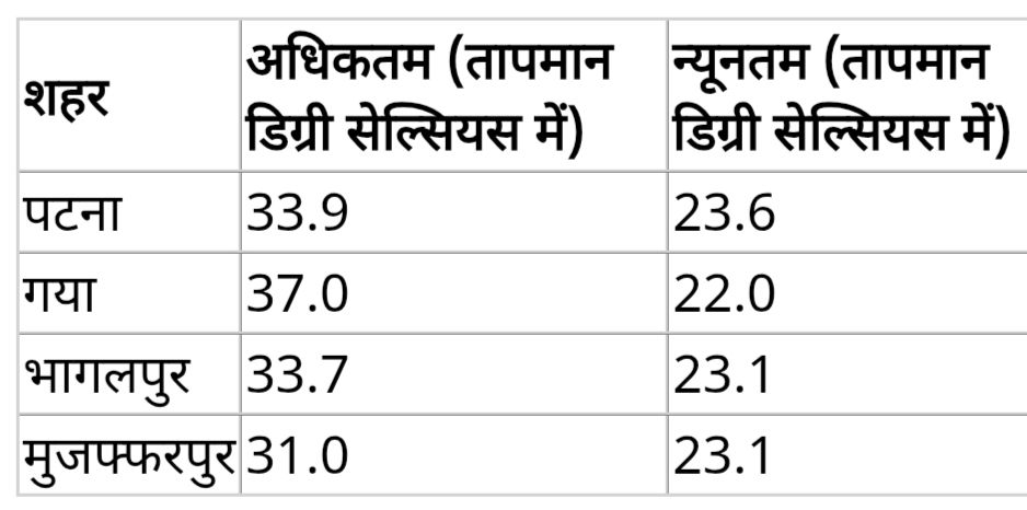 शनिवार को पटना का अधिकतम तापमान 33.9 डिग्री सेल्सियस एवं 37.0 डिग्री सेल्सियस के साथ गया में सर्वाधिक अधिकतम तापमान दर्ज किया गया। वाल्मीकि नगर में 3.0 मिमी वर्षा दर्ज की गई। डेहरी को छोड़कर पटना सहित शेष जिलों के अधिसंख्य भागों के अधिकतम तापमान में वृद्धि दर्ज की गई।